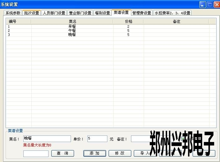1、在軟件上先添加一下早中晚餐的金額。在系統設置里面的菜譜設置里設置是。