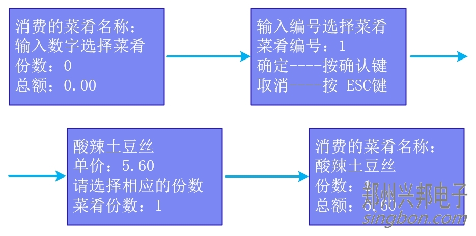 ① 自動模式:輸入菜肴編號,點擊確認后選擇份數,點擊確任后出現消費的菜肴名稱、份數、總額,將卡片放于刷卡區,即可進行扣費,扣費后顯示扣費金額、手續費用、卡上余額、卡號,操作流程如下圖所示: