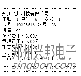 ② 計算模式:輸入扣費金額,按[確認]鍵后,將卡片放于刷卡區,即可進行扣費,若連接的有打印機,可直接打印消費明細,打印出的信息如下圖所示: