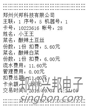 3) 自動消費模式:最多可設置8個費率,每個費率可設置對應的菜肴、份數,將費率設置好之后在自動模式下輸入相應的費率編號放卡即可自動扣除相應費用。只有計算和自動模式可以用,計算模式只作為查看使用,不能扣費。若連接的有打印機,可打印消費明細,打印出來的消費明細格式如下圖所示: